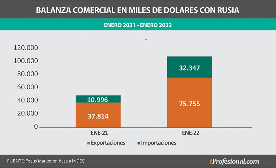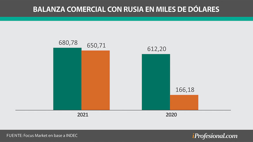 Ahora si lo vemos desde el punto de vista de las exportaciones, en el 2021 nuestro país exportó hacia Rusia productos (entre los cuales se encuentran limones, maníes sin cascara, leche entera, ciruelas disecadas, langostinos entre otros) por el valor de u$s680,782 millones generando así un saldo comercial de u$s30,071 millones entre nuestro país y Rusia.