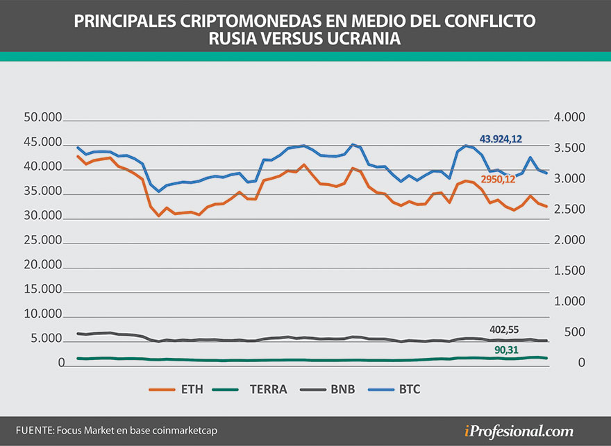 Otro de los efectos colaterales de esta invasión rusa se da en el campo de las criptomonedas que durante estos últimos días los principales activos digitales tocaron niveles máximos, tales como Bitcoin u$s44.354, Ethereum u$s2700, Binance u$s420 y Terra 90.3 dólares.