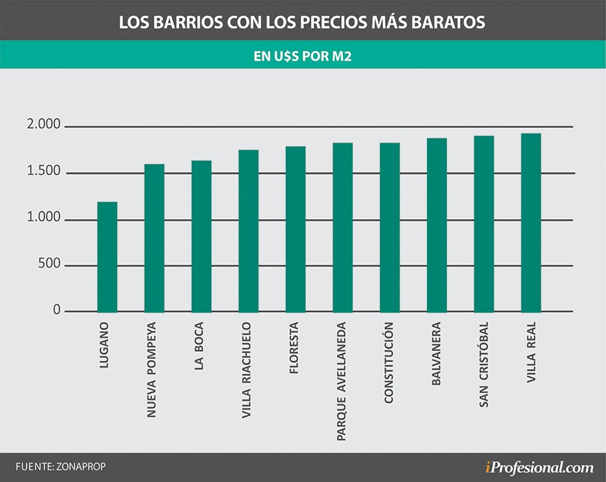Al analizar por metro cuadrado, la zona sur de la Ciudad de Buenos Aires se presenta, según los últimos reportes, como la más barata: en escala creciente, aparece Villa Lugano (u$s1.133/m2), seguido de Nueva Pompeya (u$s1.572/m2) y, por último, La Boca (u$s1.636/m2).