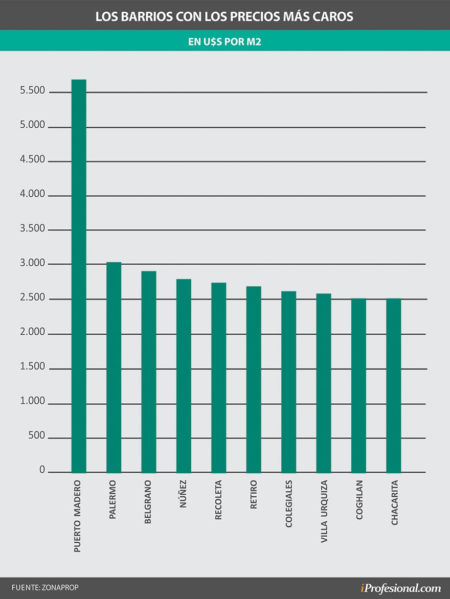 En contraposición, los más caros son Puerto Madero (u$s5.569/m2), Palermo (u$s3.024/m2) y Belgrano (u$s2.892/m2).