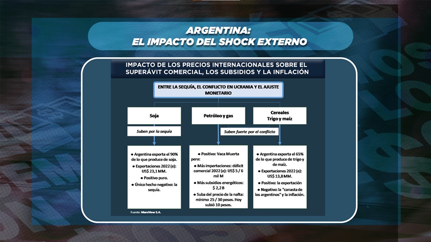 Pero dentro de todo lo que preocupa respecto de la situación económica, entra muy en juego el shock externo que se está generando, que impacta sobre todo en los precios internacionales y como consecuencia, sobre el superávit comercial, los subsidios y la inflación.