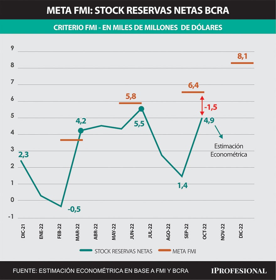 El acuerdo con el FMI establecía como meta un stock de reservas netas de u$s6.400 millones para fin de septiembre, y Econométrica estima que faltaron u$s1.500 millones para cumplir con la meta del FMI.