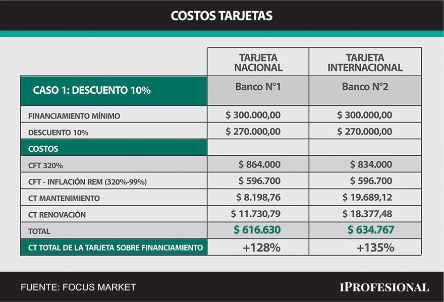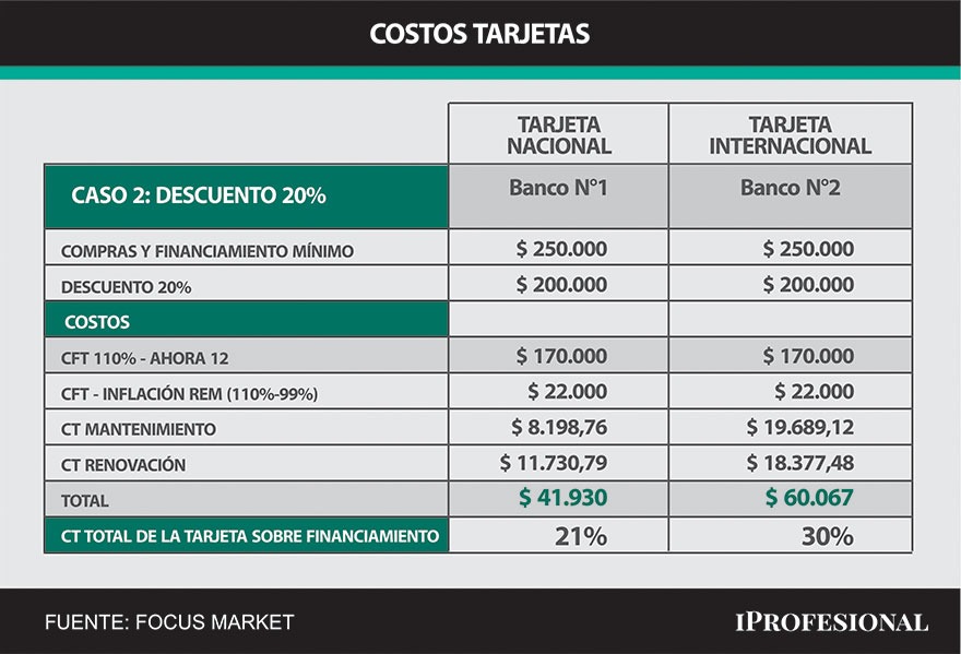 Supongamos que un argentino con una tarjeta de crédito puede obtener un financiamiento mínimo por $180.000 (tomaremos el Caso 1 teniendo en cuenta dos bancos con distintos costos de mantenimiento y de renovación anual en ambos casos), además se supone un 30% de descuento por poseer esa tarjeta sobre el monto a financiar.