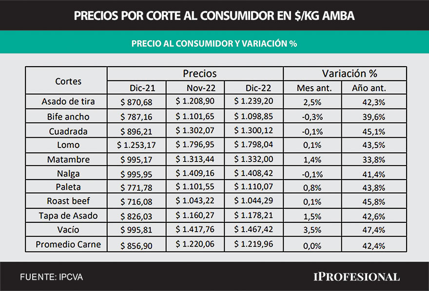 Según datos del Instituto de Promoción de la Carne Vacuna Argentina (IPCVA), entre diciembre de 2021 y diciembre de 2022 el kilo de pollo pasó de $215,4 a $436,3, una suba de 97,9% interanual, mientras que el kilo de pechito de cerdo pasó de $593,5 a $957,8, un 61,4% más. En cambio, el promedio de cortes de carne vacuna registrados por la encuesta del IPCVA pasó de $856,9 a $1.219,9, una suba de 42,4% en el año.