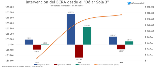 Por el momento se han liquidado u$s815 millones a $300, y de ellos el Banco Central ha vendido u$s421 millones, lo que conlleva a una compra neta de u$s394, emitiendo $154.000 millones (un 2,9% de la base monetaria) en la acumulación de tales divisas. Ello da un ratio de retención de divisas del 48%, que para ser "exitoso" este programa, debería de estar subiendo.