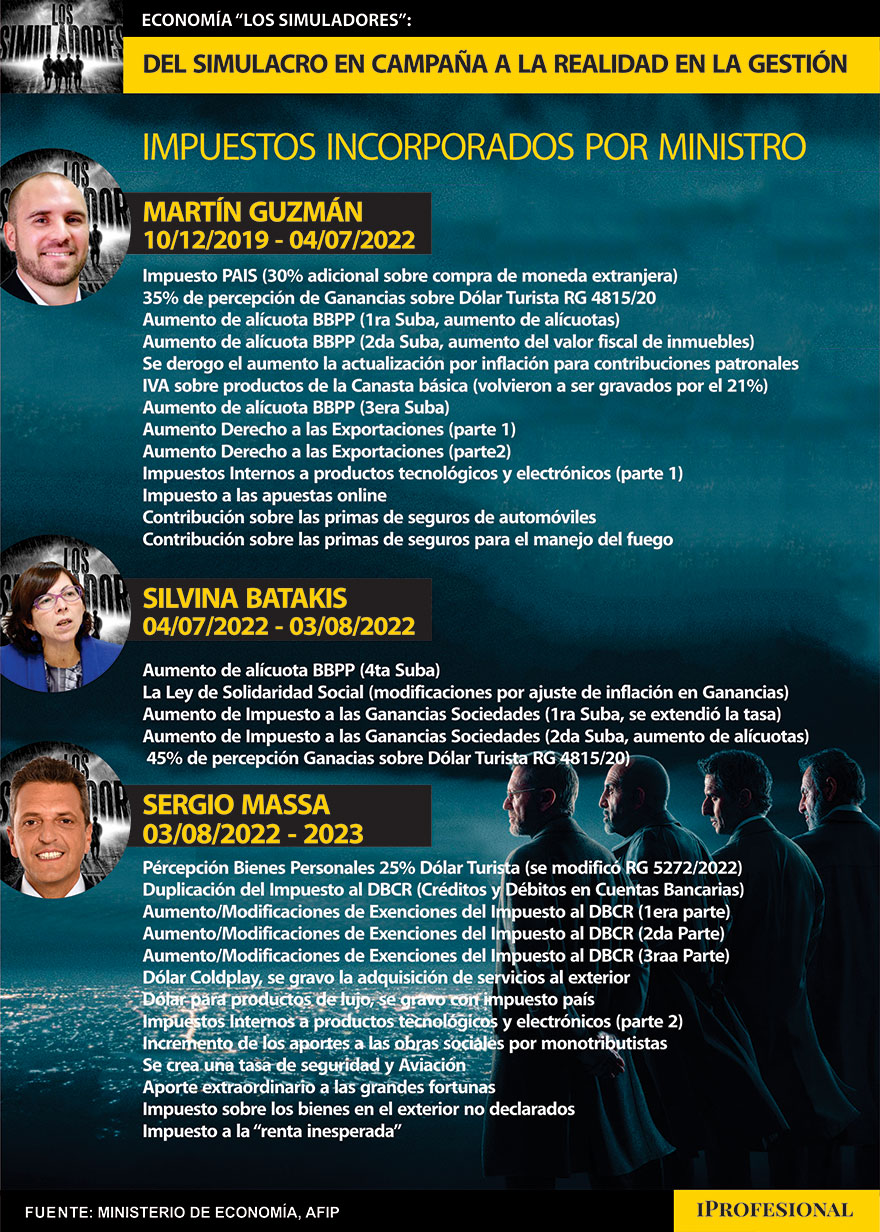 Y si ahora pasamos a este último super ministro de Economía (ahora candidato a presidente) tuvo 3 aumentos sobre los impuestos a débitos y créditos , así como la creación de impuestos como el de la renta inesperada y otro como el de las grandes fortunas, quedando en claro que la presión tributaria es una de las medidas que este gobierno utiliza como parte de la política económica para sobrecalentar la economía.