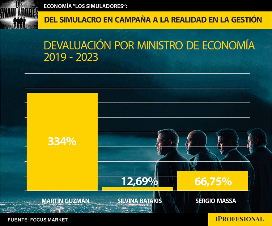 Al analizar la devaluación del peso frente al dólar durante el actual gobierno fue de más del 600%. Martin guzmán fue el ministro con el cual más se debilitó el peso en un 344%. Batakis en sólo un mes 12,6% y Sergio Massa 66,7 por ciento.