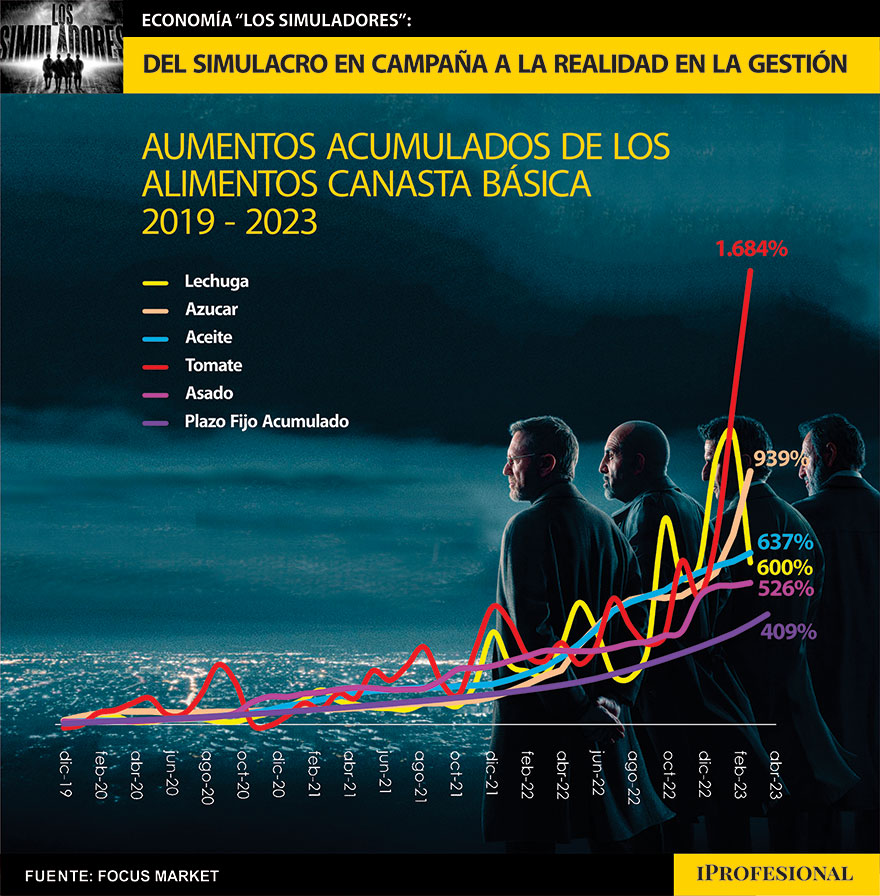 En la misma línea de la inflación, tenemos a los aumentos acumulados de los principales alimentos de la canasta básica, en donde el kilo de tomate aumentó en forma acumulada 1.694%, 1 kilo de azúcar 939%, 1 litro de aceite 637%, 1kg de lechuga 600% y 1kg de asado 526 por ciento.