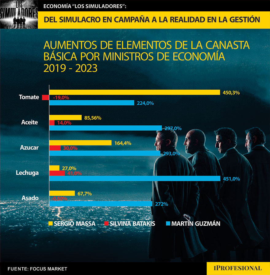 Al poner el foco en alimentos, el ministro que más aumentos registró fue Guzmán. El kilo de lechuga subió 451% en su período de gestión, el kilo de azúcar en el periodo de Batakis aumentó un 30% y en el periodo de Massa el kilo de tomate escaló en 450 por ciento.