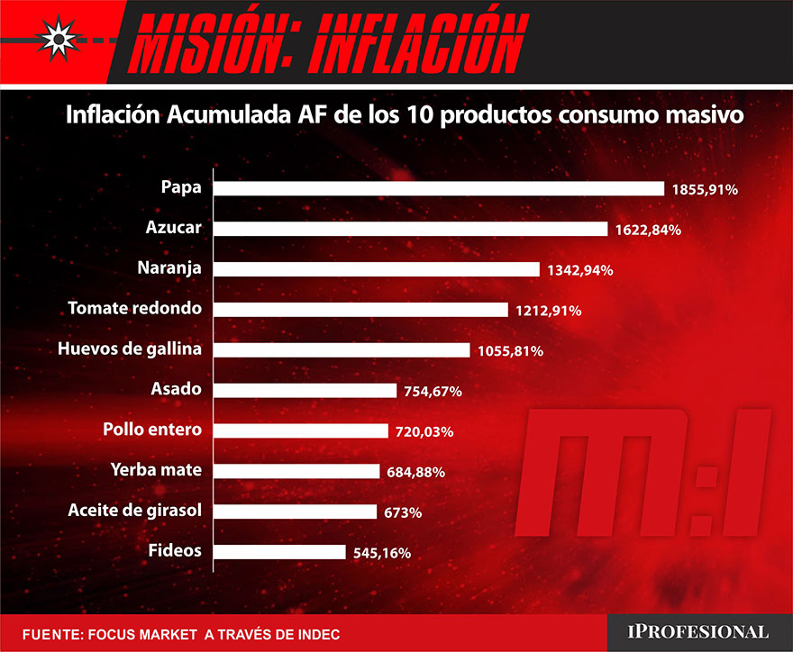 Si tomamos los principales productos de la canasta básica en todo el período presidencial (diciembre 2019 – agosrto 2023), se puede ver que la papa aumentó un 1.855%, el azúcar un 1.622%, la naranja un 1.342%, el tomate 1.212% y huevos 1.055%, entre otros. Es decir, en 45 meses se tuvieron aumentos de más del 1.000 por ciento.