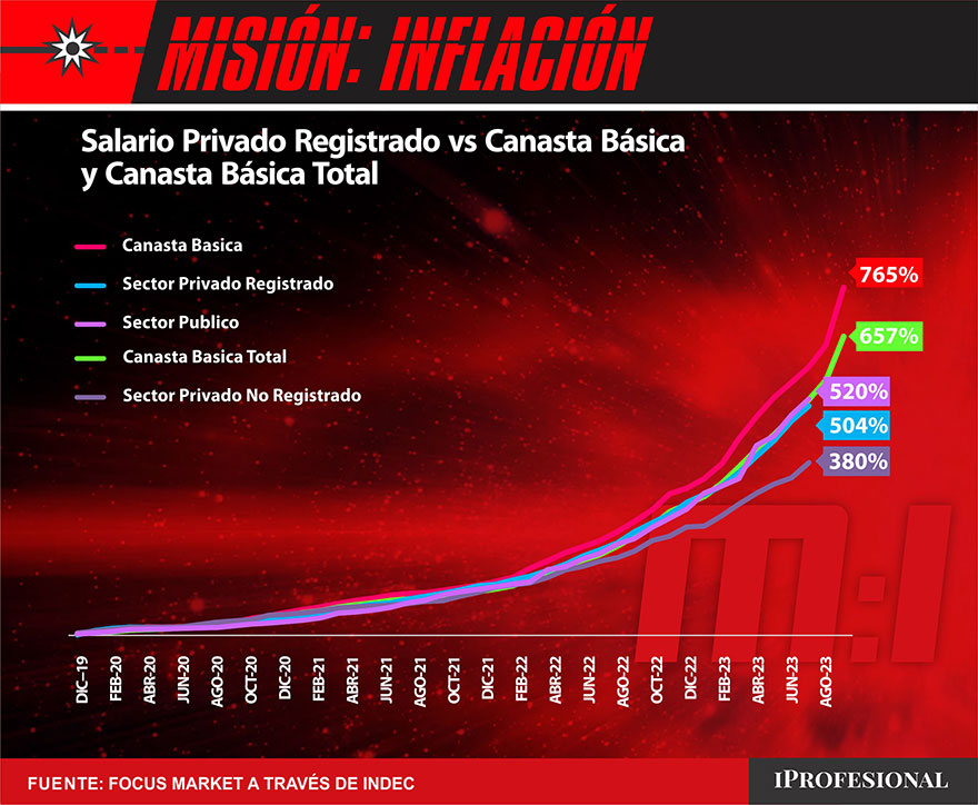 En el mismo período de tiempo, los salarios privados no registrados aumentaron un 380%, el salario privado registrado un 504%, y el salario del sector público en 520%. Mientras los productos de la canasta básica suben por el ascensor en un 639%, los ingresos de los trabajadores van por las escaleras, siendo los más perjudicados los que tienen en empleos no registrados.