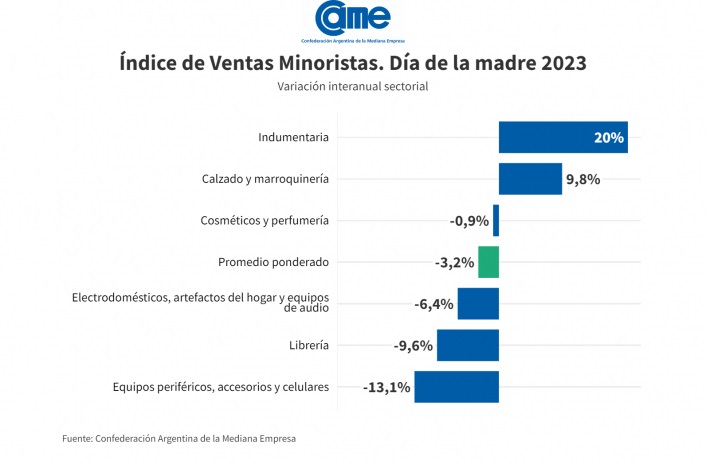 En cuanto a los rubros, cuatro de los seis sectores relevados registraron caídas interanuales en sus ventas mientras que sólo dos crecieron. La mayor retracción ocurrió en Equipos periféricos, celulares y accesorios que disminuyeron 13,1% frente al Día de la Madre del año pasado. El que más subió fue Indumentaria con 20%.