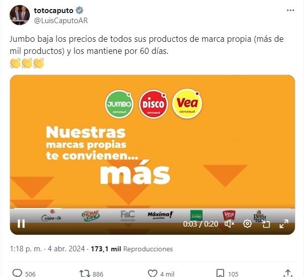 "Jumbo baja los precios de todos sus productos de marca propia (más de mil productos) y los mantiene por 60 días", posteó el ministro en la red social X seguido de la promoción de la cadena y acompañado por un emoji de aplausos.