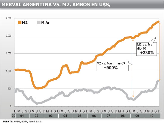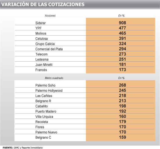 - Ahora bien, si se compara la evolución diciembre de 2009/2010, se observa un movimiento ascendente en ambos, aunque mucho más pronunciado en el caso de las acciones. Así las cosas, mientras que el valor del m2 se incrementó hasta un 15%, las acciones nacionales ganaron casi un 80% en dólares.