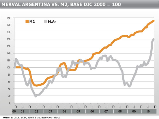 Vale decir que, si se considera punta a punta -junio 2002 (422 unidades) a diciembre 2010 (200 unidades)- el índice Merval logró recuperar posiciones y achicar la brecha. Aun así, no llegó al mínimo alcanzado en febrero de 2005.