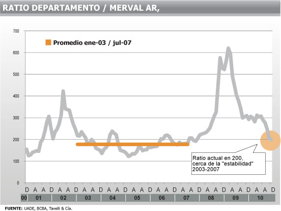 "Sin embargo, a partir de julio de 2007 se produjo un quiebre, ya que los valores de los inmuebles continuaron su senda alcista, mientras que las acciones locales mostraron, primero, un pequeño movimiento amesetado, para luego pasar a una corrección bajista -que duró hasta marzo de 2009- recuperándose luego en forma sostenida durante el resto del año", remarcó Vera. En efecto: