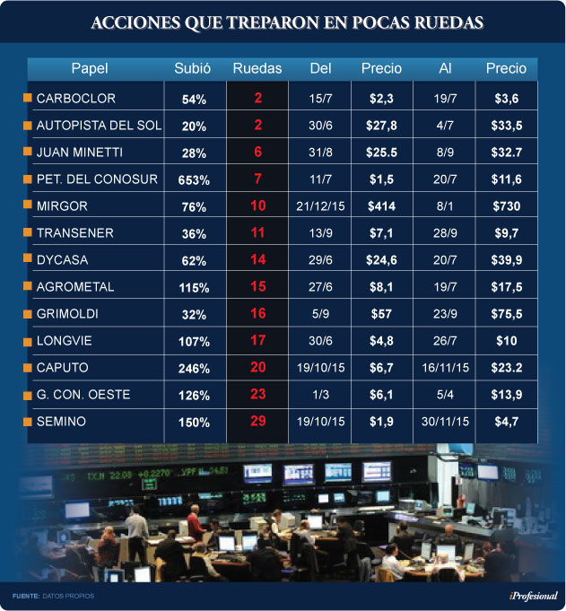 Si se observa en los últimos meses los mayores incrementos, se pueden citar a Carboclor y Autopistas del Sol: 54% y 20% respectivamente en dos días.