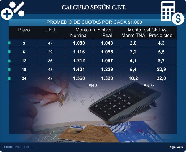 Si se busca encontrarle el lado positivo al asunto, se concluirá que aplicando el C.F.T. "a full", el monto a devolver tomando en cuenta la inflación será menor al 10% para los plazos más cortos, pero trepará hasta por encima del 30% si se opta por las 24 cuotas.