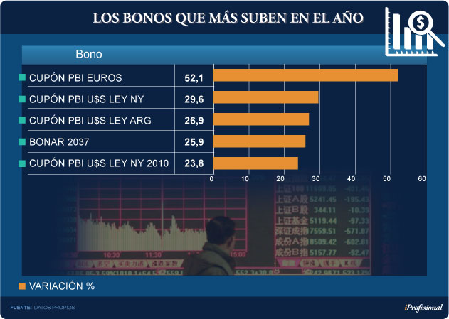 Sólo en el cuarto lugar se posiciona un bono con otras características, el Bonar que vence en el 2037, que trepa 26% en estos nueve meses del año.