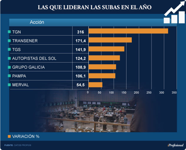 Un escalón más abajo se ubican Transportadora de Gas del Sur (TGS), con una escalada del 142%, y Autopistas del Sol, que trepa 124 por ciento.