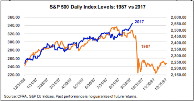 "Si comparamos los niveles diarios del S&P 500 en 1987 con la progresión hasta el momento en 2017, observamos una evolución extrañamente similar", advierte.