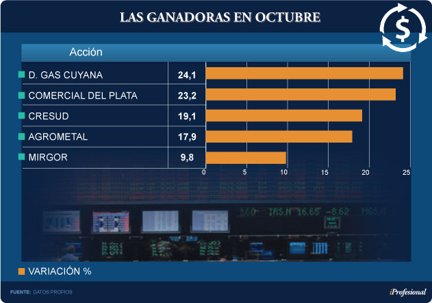 Bajo estas condiciones, las grandes ganadoras de octubre fueron Distribuidora de Gas Cuyana (24%), seguidas por Comercial del Plata (23%) y Cresud, con el 19%.