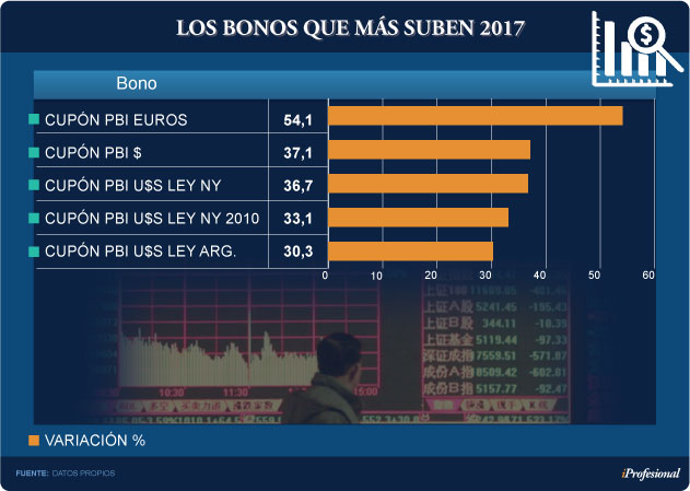 En cuanto al resto de los bonos, a la vanguardia del listado se ubica el Par con ley de Nueva York, con subas del 25%, y los Discount, que en promedio avanzan un 23%.