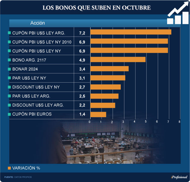 En tanto, en títulos públicos el gran ganador de octubre fue el Cupón PBI en dólares con el 7,2%, seguido por la versión del 2010, con un alza de 6,9 por ciento.