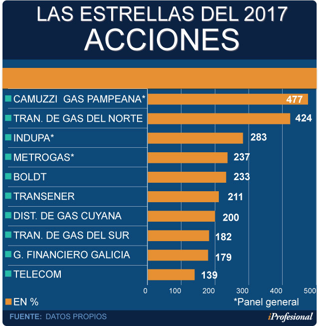 Camuzzi Gas Pampeana (477%), que cotiza en el Panel General, es la que lidera el ranking 2017.