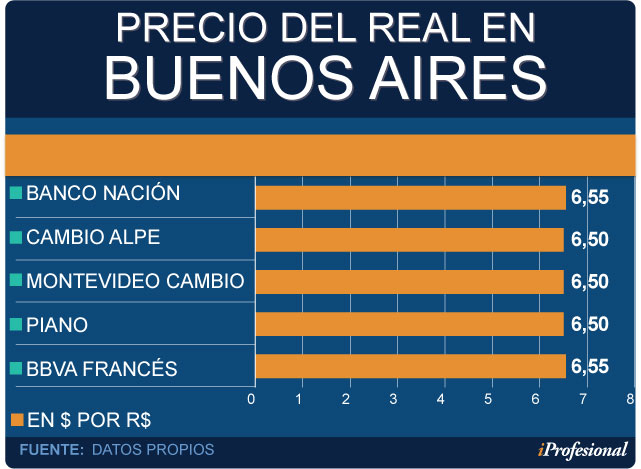 Si se decide realizar la operación de cambio dentro del paí­s, el turista se encontrará con un rango de precios oscilará entre los $6,50 a los $6,55 por cada unidad de moneda brasileña.