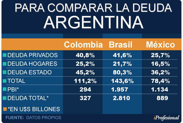 Los datos regionales revelan que la deuda argentina es la mitad que la de Brasil, o bien, un 65% del pasivo de Colombia y apenas por debajo de la deuda mexicana.