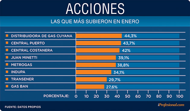 En lo que va de enero, la que más viene ganando es Distribuidora de Gas Cuyana (44%). El segundo lugar lo ocupa CentralPuerto (43,7%).