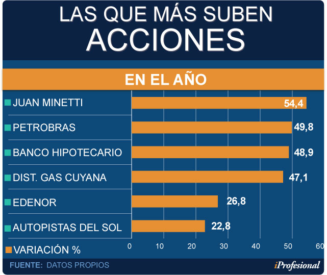 En el primer grupo, en este inicial bimestre del 2018 sobresale Juan Minetti, que gana 54%, seguida por Petrobras, con casi 50%, Banco Hipotecario (49%) y Distribuidora de Gas Cuyana, que supera el 40%.