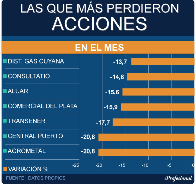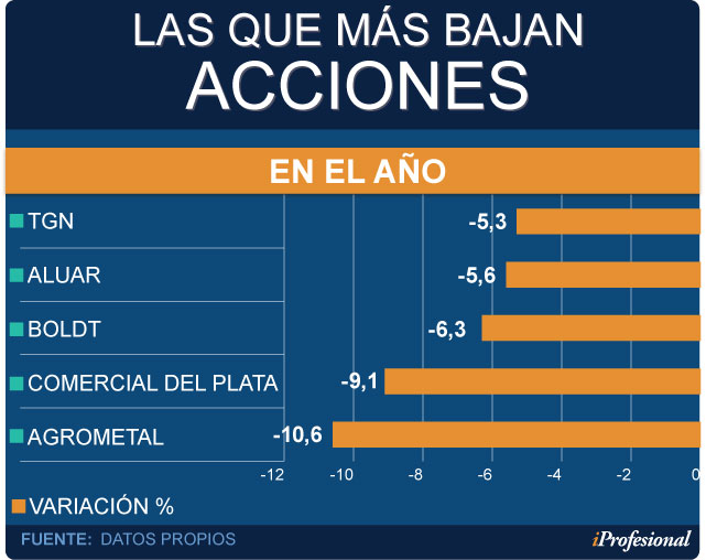 En sentido inverso, las más afectadas por los vaivenes del mercado son Agrometal, con una caí­da de casi 11%, Comercial del Plata (-9%) y la tecnológica Boldt, que pierde más de 6% en estos dos primeros meses.