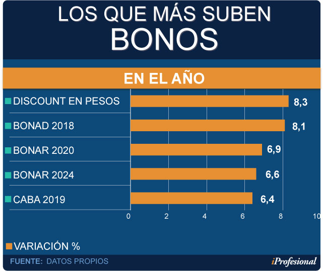 Por el lado de los tí­tulos públicos, los que mostraron el mayor rendimiento son el Discount en pesos, que superó la marca del 8%, seguido de cerca por el Bonad 2018, y los Bonar 2020 y 2024, estos últimos dos por encima del 6%.