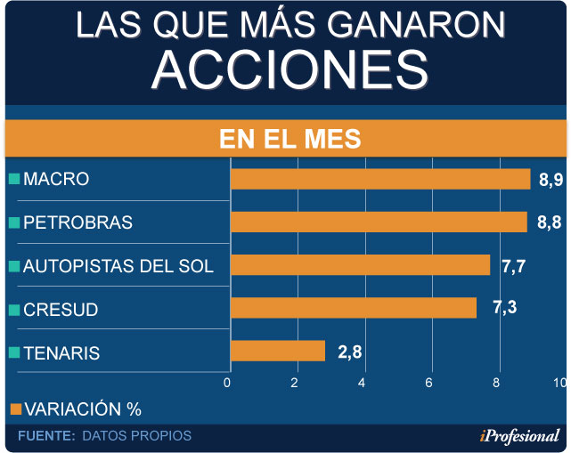 En tal sentido, la delantera la asumió Banco Macro, que escaló 8,9%, seguido de muy cerca por Petrobras, que ganó un 10%.