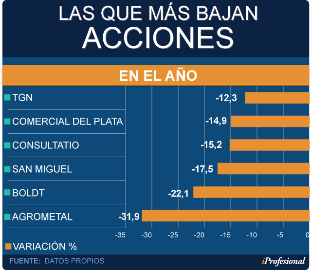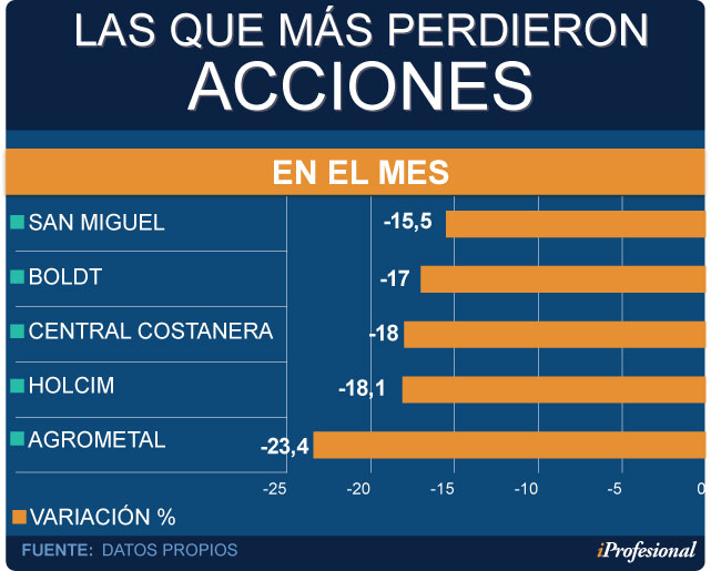 Todo ello se vio reflejado en la práctica en el retroceso que experimentó el Merval en marzo, con acciones que llegaron a caer hasta 23%, como es el caso de Agrometal, seguida de cerca por Central Costanera, Holcim y Boldt, un tridente que descendió alrededor del 17% al 18%.
