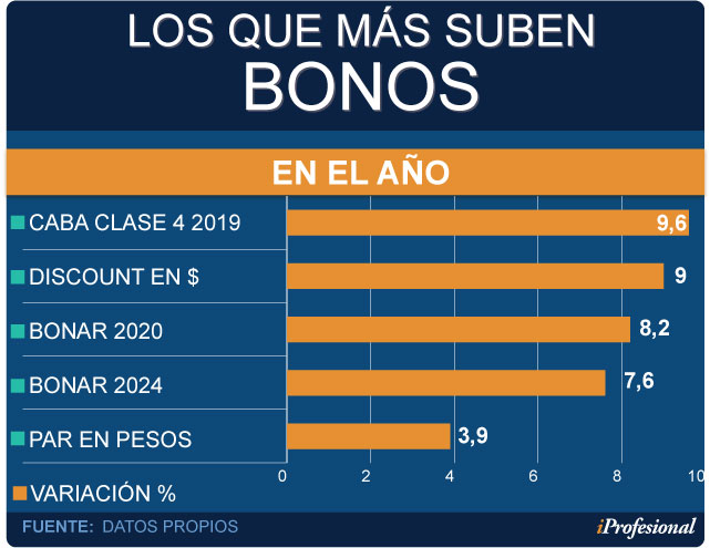 Por el lado de los títulos públicos, lo más notable es el avance de los "dólar linked" de la Ciudad de Buenos Aires, que avanzan hasta 9,6%, seguidos por el Discount en pesos (9%) y el Bonar 2020, que gana un 8,2%.