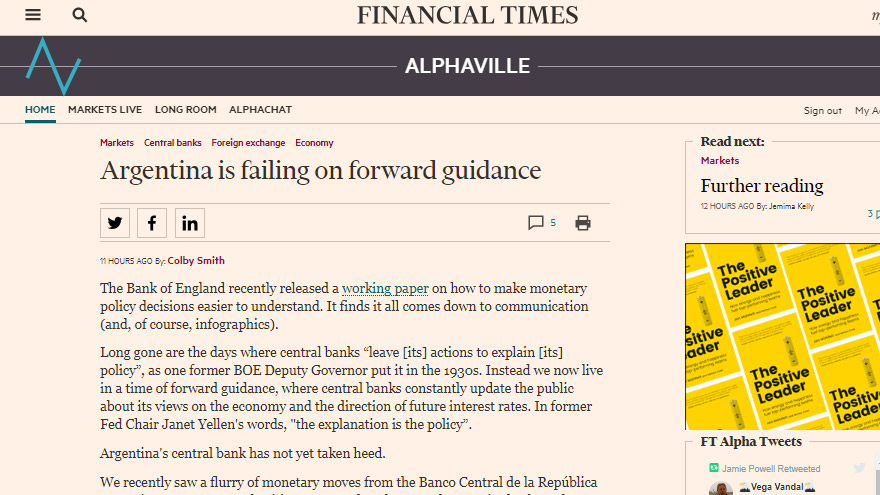 El influyente periódico británico Financial Times publicó un artículo en el que cuestiona con dureza las políticas del Banco Central bajo el mando de Luis Caputo.