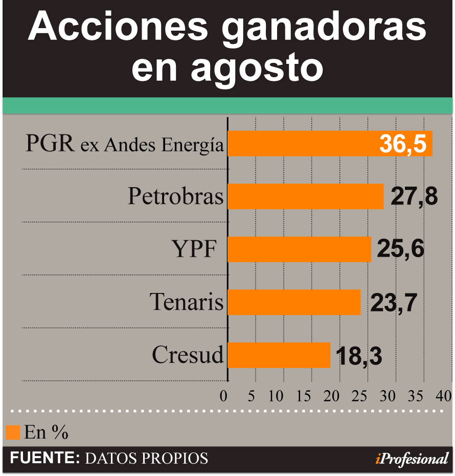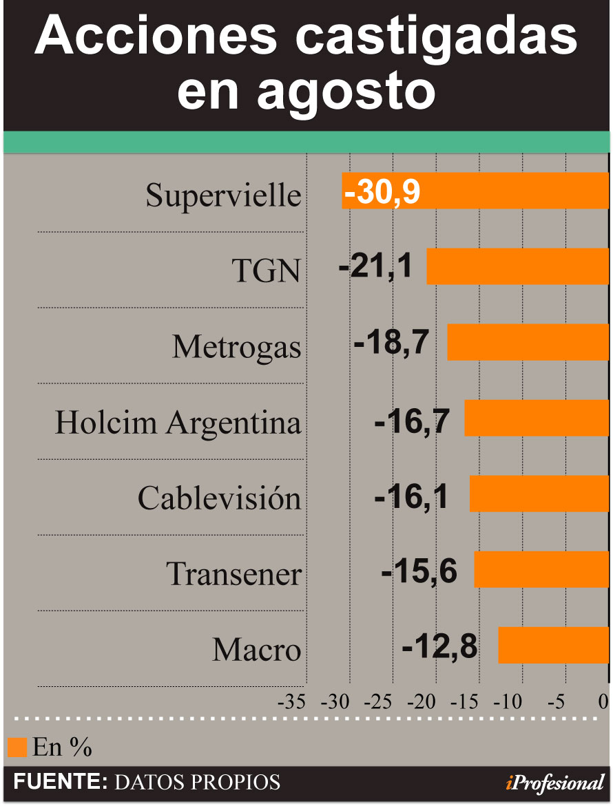 Después siguieron las bajas de Transportadora de Gas del Norte (TGN), que cayó 21,1% en agosto, seguida por Metrogas (-19%) y Holcim Argentina (-17%), entre las principales bajas.