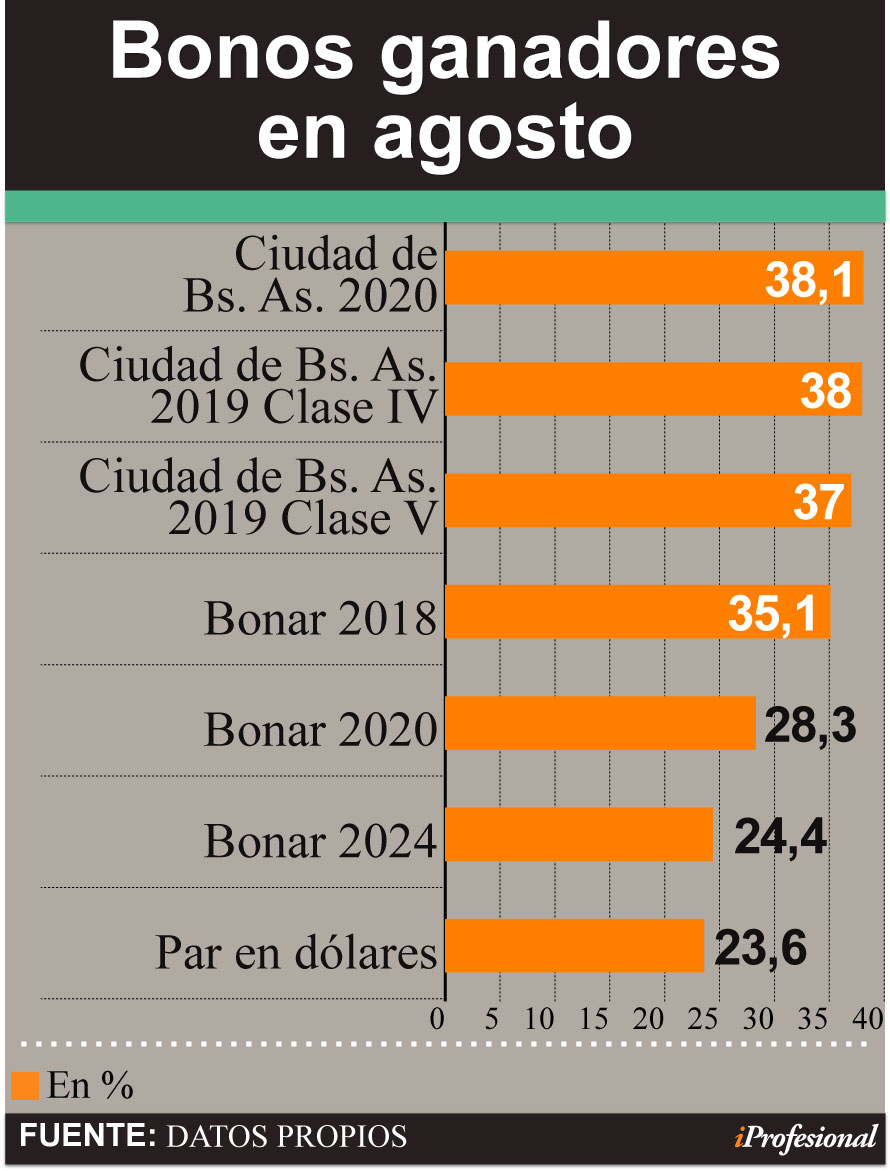 En cuanto a los bonos más ganadores de agosto, se destacan los nominados en dólares y los “dólar linked”, que son aquellos emitidos en pesos que siguen el comportamiento de la devaluación de la moneda.