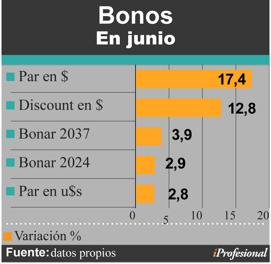 Por el lado de los títulos públicos, los mejores recorridos de junio los obtuvieron el Par denominado en pesos, que avanzó un 17,4%, seguido por el Discount en la misma moneda, con un alza del 13%. Mucho más abajo se ubicaron el Bonar 2037, con el 4%; y el Bonar 2024, con cerca del 3%.