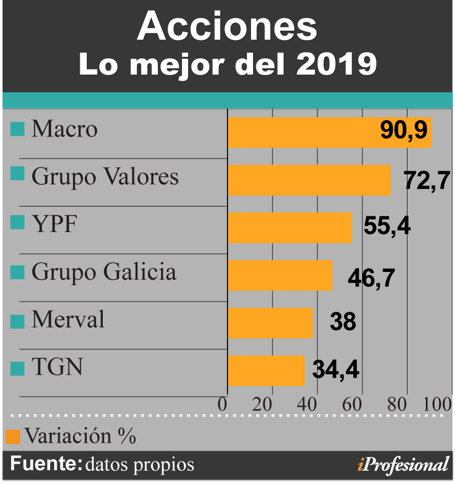 En este escenario, los mejores resultados vinieron por el lado de papeles del sector financiero, como BYMA y Banco Macro, que subieron alrededor de 40%, al que se le agregó en el podio el Grupo Valores, que avanzó 36%. Más abajo se ubicaron Grupo Galicia (32%) y Pampa, con 30,5%.