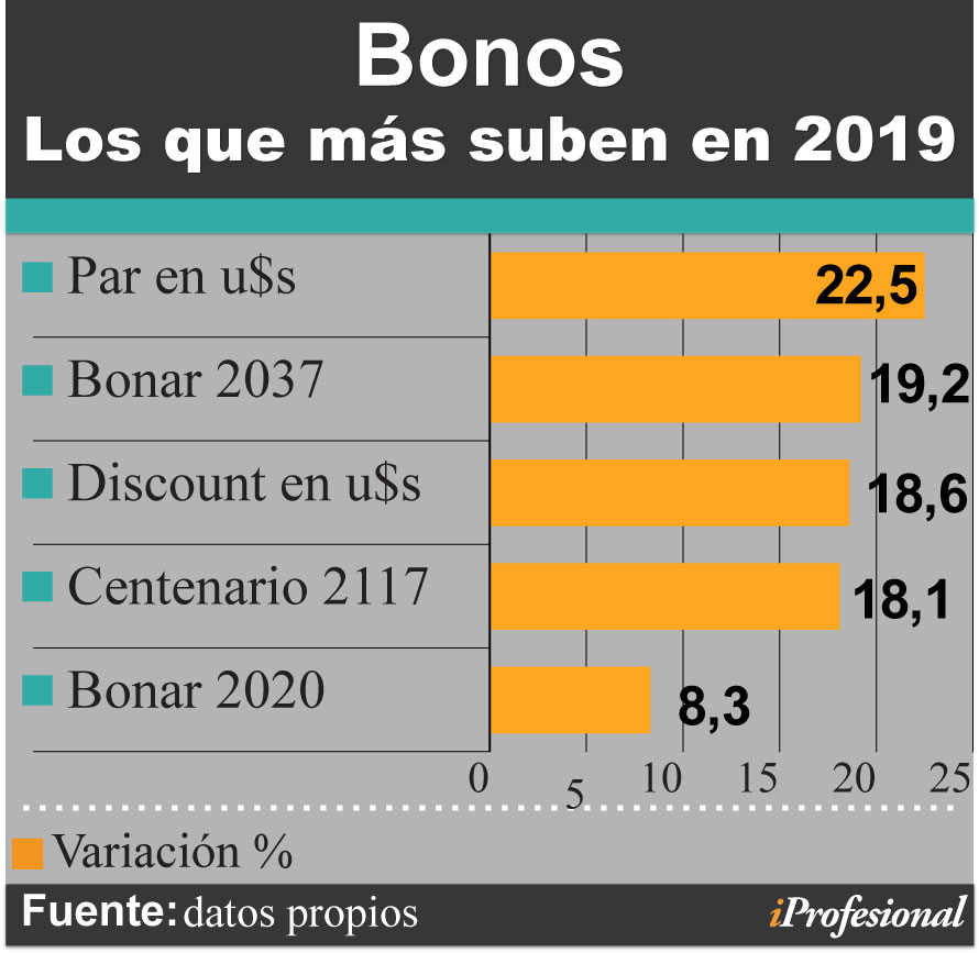 Las mayores subas se observaron en bonos emitidos en dólares, como el Par que aumentó casi 23%, seguido por el Bonar 2037 con ganancias cercanas al 19%. El podio lo completó el Discount en dólares, con el 18,6%.