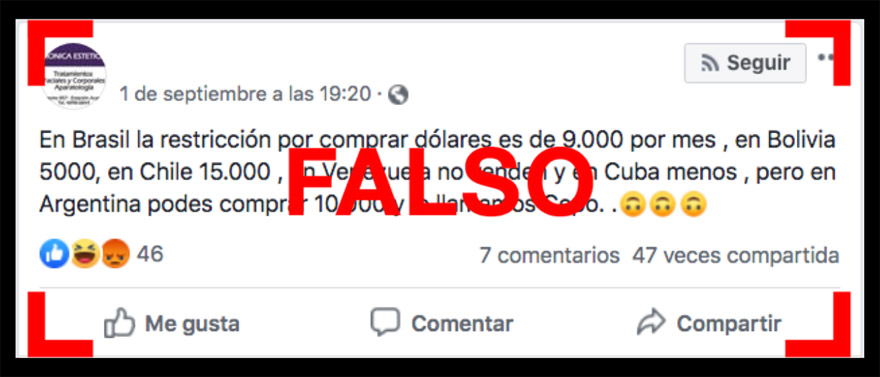 Luego de que el Banco Central de la República Argentina (BCRA) estableciera el domingo último un tope mensual en la compra de dólares para personas físicas, circula en Twitter una publicación que sostiene: "En Brasil la restricción por comprar dólares es de 9.000 por mes, en Bolivia 5000 , en Chile 15.000 , en Venezuela no venden y en Cuba menos , pero en Argentina podes comprar 10.000 y lo llamamos Cepo" (sic). Sin embargo, en ninguno de estos países existe una restricción formal como la que hay en nuestro país; aunque en Venezuela y Cuba existen limitaciones de acceso en la práctica.