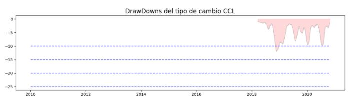 Como podemos observar, la probabilidad de retroceso de la curva del CCL con respecto a su máximo, es bastante baja, tan baja que no pudo llegar al nivel más alto de baja probabilidad registrado en 2018 (12%). Es decir, palabras más, palabras menos, la probabilidad de que el tipo de cambio en los próximos días baje es cada vez menor.