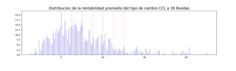 En los últimos 252 días y con un énfasis mayor en la era vulgar, la probabilidad de que el contado con liquidación crezca, es bastante alta, no tan alta como en el último trimestre de 2019, pero ha mantenido niveles bastante elevados, contando con un promedio de suba para el tipo de cambio de un 17.5% durante los próximos 30 días.