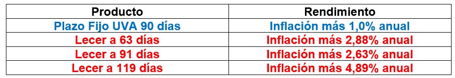 Sin embargo, estas letras de Tesorería que se llaman Ledes, compiten con las letras de Tesorería que ajustan por inflación que se llaman Lecer, por ejemplo, una letra de este tipo a un plazo de 63 días rinde inflación más el 2,88% anual, mientras que a un plazo de 91 días rinde inflación más el 2,63% anual.