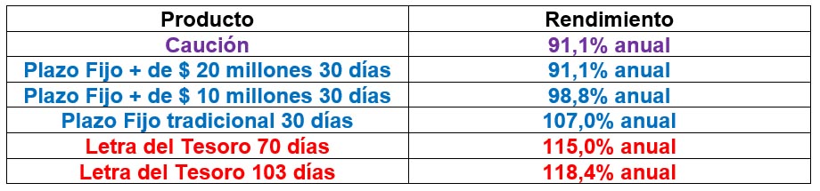 Los bancos, por colocaciones a plazo fijo, nos muestran una tasa efectiva de rendimientos decrecientes a 30 días de plazo del 107,0% anual, 98,8% anual y 91,1% anual. Un plazo fijo ajustado por inflación nos da un rendimiento de inflación + 1,0% anual.
