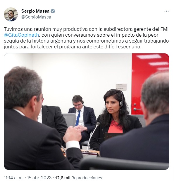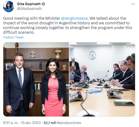 "Buena reunión con el ministro Sergio Massa. Hablamos del impacto de la peor sequía en la historia argentina y nos comprometimos a seguir trabajando de cerca para fortalecer el programa ante este difícil escenario", explicó Gopinath en un tuit.